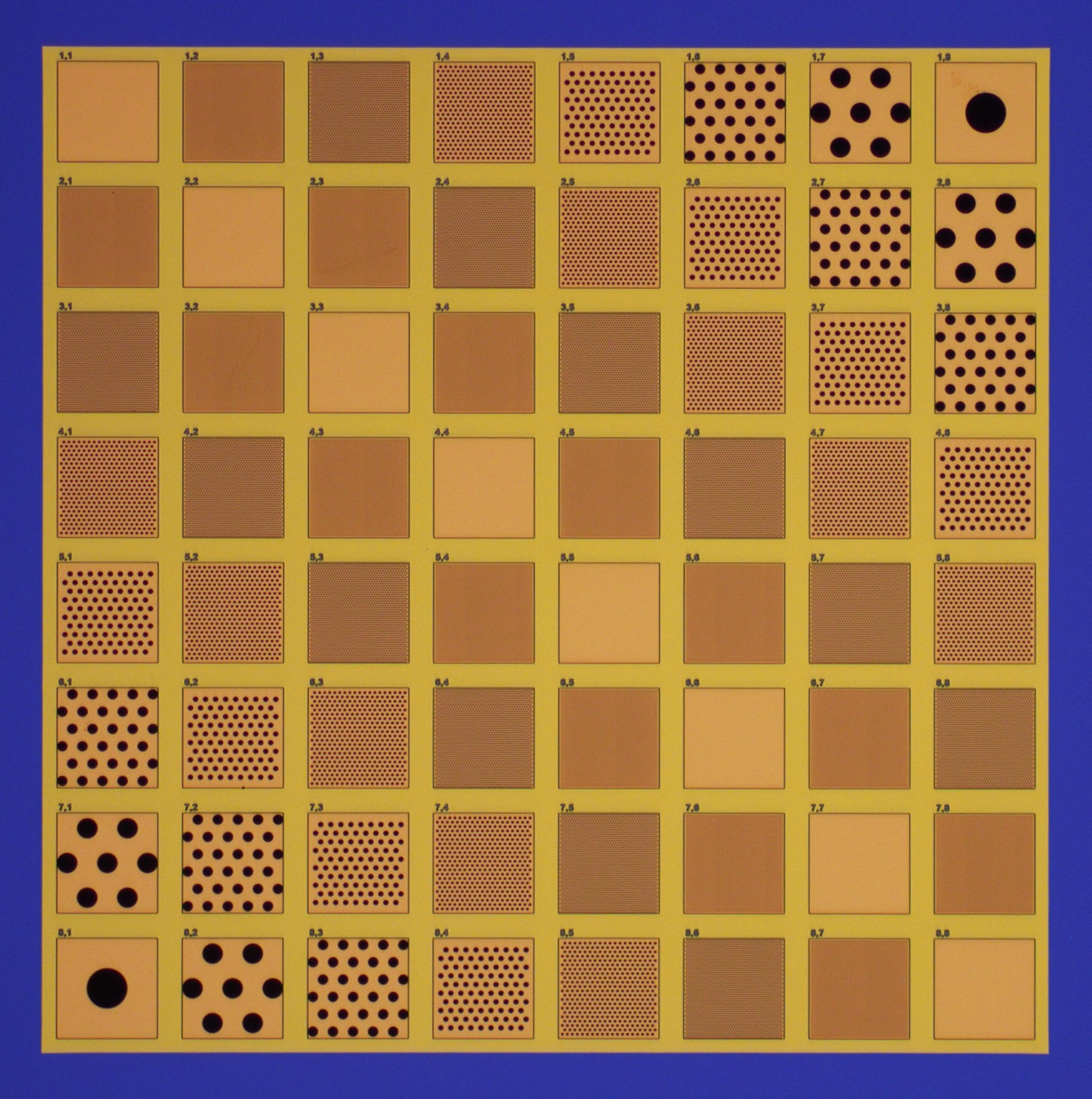 Each membrane is uniquely labeled with its coordinates, for ease of finding and recording sample location, and each grid has a large, unique, two digit ID, visible without a microscope to easily distinguish samples.